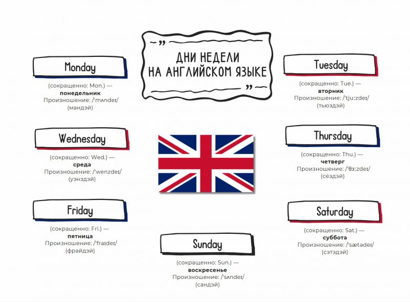 В английском языке используется семь дней недели, как и в русском. Они имеют устойчивый порядок и стандартные сокращения.