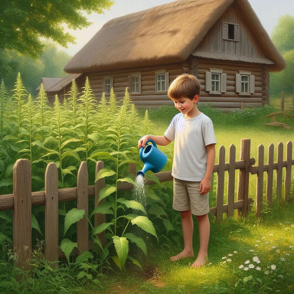 Однажды к забору подошёл мальчик Петя. Он хотел нарвать травы для кроликов и нечаянно задел крапиву. Она ужалила его, и Петя вскрикнул. Но потом вспомнил, что бабушка говорила: из крапивы можно сварить вкусный суп и даже сделать полезный чай.